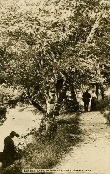 To the average resident today, the term “Lover’s Lane” is almost entirely lost. Unlike outdated names such as Red Bridge, which has been replaced and painted green for decades, Lover’s Lane is not a title still used. Perhaps this is because, unlike Red Bridge, it’s not an immediately recognizable location. The path and roadway through the trees is nondescript and, without the annotations, we’d be unlikely to tell it apart from walking paths in Deephaven, Excelsior, or any other town across the greater Midwest.