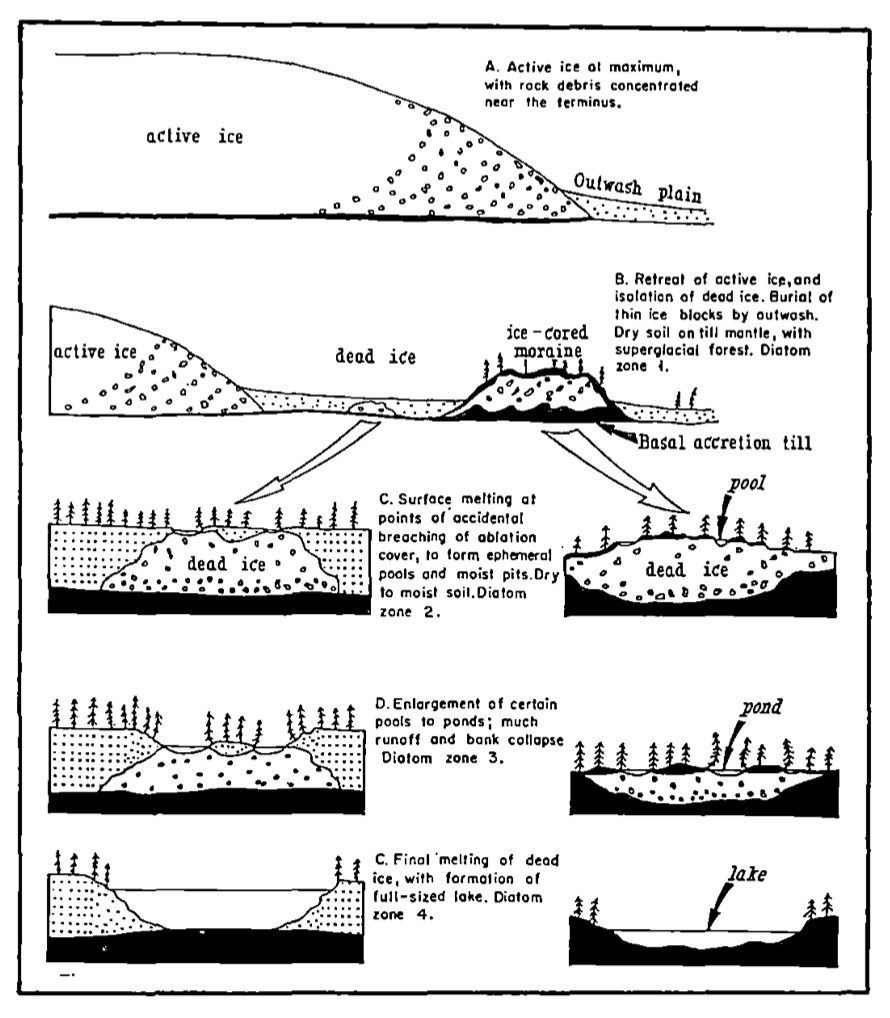 The image above is a helpful descriptor of how lakes are formed as an active ice glacier recedes and leaves behind trapped water pockets and dead ice. It also depicts the sedimentary deposits that can be deposited from within melted ice.